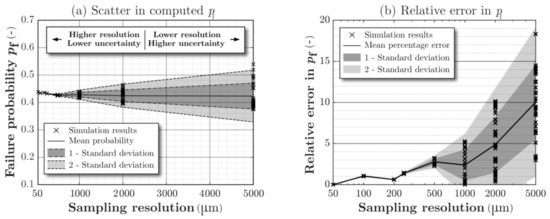 In Figure 15b, the relative error in the failure probabilities, with respect to the probability computed at the highest resolution of 50 μm, is plotted as a function of sampling resolution based on