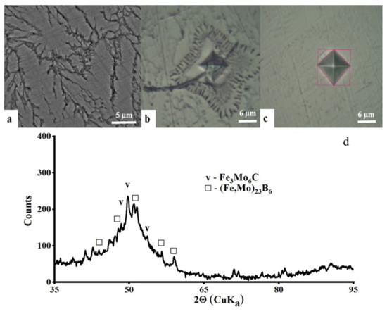 X-Ray analysis of the as-cast sample confirmed that the sample is in an amorphous-crystalline state (see the amorphous halo in Figure 1d). The determined crystalline volume fraction reached approximately 30%. Moreover, analysis shows that carbides structures are similar to the Fe3Mo3C composition.