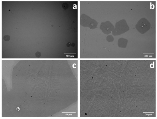 It should also be noted that the occurrence of an amorphous and crystalline phase in the as-cast sample was confirmed by the SEM analysis (Figure 2). It is observed that the sample has amorphous and crystalline phases (Figure 2a,b). Crystallite particles are distribute in an amorphous matrix and have a dendrite structure (Figure 2c,d). It should also be noted that the obtained SEM results are in a good agreement with the XRD analysis (Figure 1d).