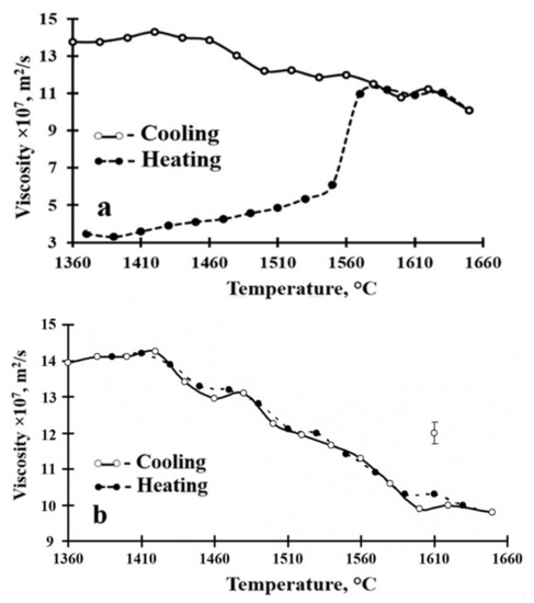 From the literature, it is known that for homogeneous melts, the viscous flow decreases with increasing temperature [41]. However, micro-inhomogeneities transferred from solid state may be present in metallic melts. These micro-inhomogeneities are specific for each melt and can persist for a long time [41]. The presence of micro-inhomogeneities can be evaluated from the heating and cooling curves for some structure-sensitive property of the melt (most frequently from its viscosity). By heating above the temperature of homogeneity, the melt irreversibly converts to a true solution state, which produces significant changes in the metal solidification conditions [41].