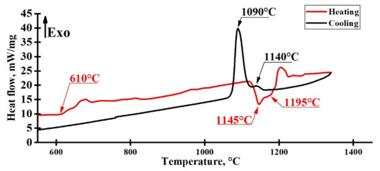 Figure 4 is showing the DSC curves of the as-cast sample. It is clearly seen that the crystallization and phase transformation processes started at about 600 °C and the melting process has started at above 1100 °C. Unfortunately, the characteristic property of DSC equipment did not allow us to heat up the sample above the 1400 °C, therefore it was impossible to obtain the melting of the whole volume of it. However, several phases were partly melted (approximately, with two different composition). On the cooling DSC curves (Figure 4), the crystallization of two phases (two crystallization peaks) is also clearly seen.