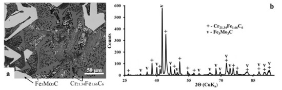The microstructure of the Fe48Cr15Mo14C15B6Y2 alloy, which was obtained after the second heating/cooling cycle, is shown in Figure 5a. This micrograph clearly shows that the alloy melt has recrystallized into a fine dispersed phase. Microhardness measurements indicated the presence of ledeburite (1490–1550 HV) and separated inclusions of complex carbides (M23C6 and M6C) (2200–2500 HV). Furthermore, X-ray diffraction of the sample revealed the presence of two phases, i.e., Cr21.34Fe1.66C6 and Fe3Mo3C (Figure 5b). Thus, we can conclude that the cast structure of alloy after recrystallization from the liquid state corresponded to the structure of the high-alloy chilled cast iron.