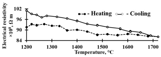 The electrical resistivity of the Fe48Cr15Mo14C15B6Y2 liquid was measured by using the rotating magnetic field method during heating (up to 1700 °C) and subsequent cooling. A working chamber was initially evacuated to 0.001 Pa, and then filled with helium to a pressure of 105 Pa. Samples were held in this chamber for 5–8 min at the melting temperature and then heated up to 1700 °C in increments of 30–50 °C. Isothermal holding at the measurement points was not less than 10 min. The electrical resistivity was measured as described in [34,35].