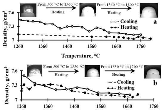 Density of Fe48Cr15Mo14C15B6Y2 alloy in the liquid state at various temperatures: (a) the first measurement from the die-cast state; (b) the second measurement of the same sample after homogenization at 1800 °C (repeated). Inserted photos (a,b) show changes in the sessile drop during the heating–cooling process in a wide temperature range.