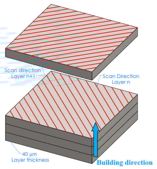 Another effect to be considered is the balling effect, which can lead to some spherical powder particles on the surface. Therefore, overlapping remelting and timing of the scan paths probably have significant influence and they are determined by the scan strategy. Bhardwaj et al. [] obtained higher density and better surface finish using the cross-directional scanning strategy, compared to the bi-directional one. A bi-directional strategy leads to a quite low temperature gradient: after the first vector, the following one impacts a higher temperature region, compared to the uni-directional strategy [].