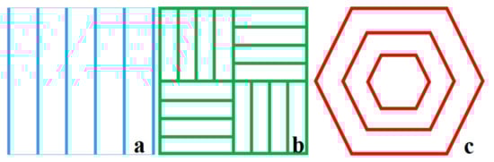 Graphical representation of the studied scanning strategies: (a) parallel stripes, (b) chessboard and (c) hexagonal.