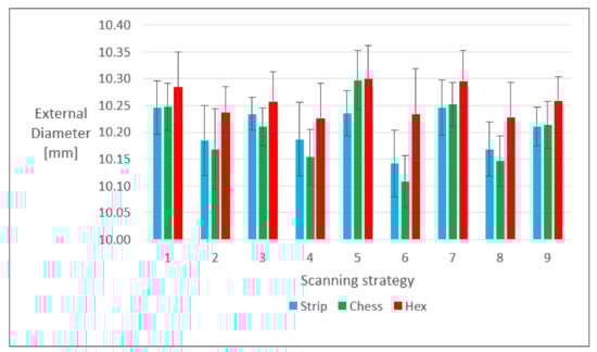 Figure 4 shows the effect of the scanning strategy on the external diameter of the as-built specimens, comparing the average and standard deviation values for each printed set. It is worth noting that all the diameters were larger than the targeted 10 mm, starting value of the y-axis, and the hexagonal strategy always led to the largest ones. A tendency for the smallest deviation for the chessboard strategy can also be seen.