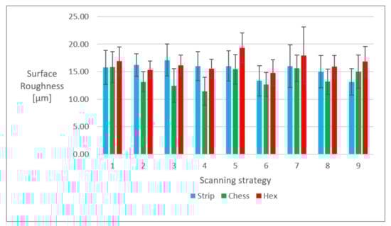 The average value and standard deviation of average surface roughness Ra, measured on the lateral surface, are shown in Figure 5, highlighting the effect of the scanning strategy. It is possible to notice that the hexagonal strategy almost always led to the highest average surface roughness values, while the chessboard strategy almost always led to the lowest average surface roughness.
