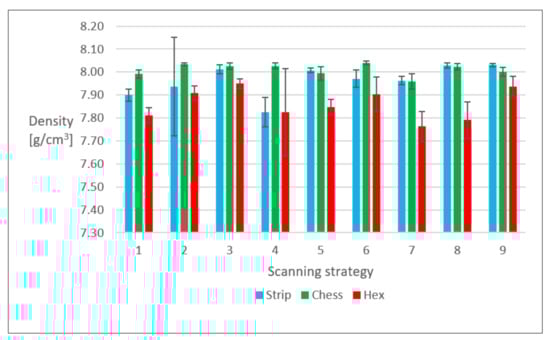 Figure 6 shows the average value and standard deviation of density for each specimen set, produced with different scanning strategies. It is possible to notice that the hexagonal strategy always led to the lowest value, while the chessboard strategy usually led to the highest density. The difference in porosity content can also be noticed with naked eyes (Figure 7) and it becomes even more evident observing the optical micrographs (Figure 8).