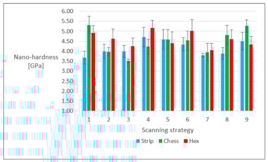 Matrixes of 12 × 12 and 20 × 20 indentations were carried out on the transverse cross-section of the mounted samples (Figure 7), using a Berkovich triangular pyramid indenter. The distance between every indentation was set to 7 µm and the load was set to 25 mN. Figure 9 shows the values of nano-hardness for each set, relatively to the different scanning strategies. It is not possible to easily distinguish a trend or define which strategy performed better.