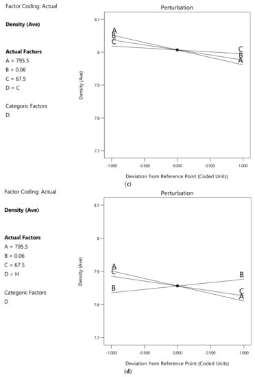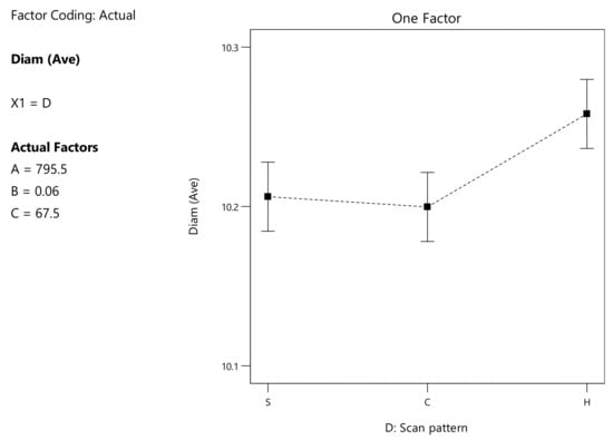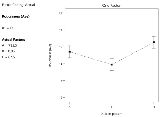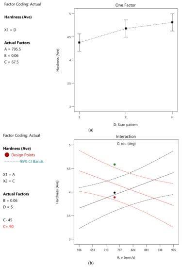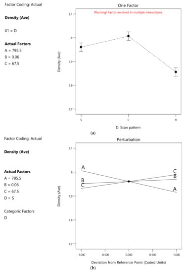 The continuous numerical variables are (A) v scan speed (mm/s), (B) h hatch spacing (mm) and (C) inter-layer rotation (°) while the discrete variable is (D) scan pattern, considering the values S for the parallel stripes, C for the chessboard and H for hexagonal patterns. ANOVA Analysis outputs will display the deviation from a Reference Point in actual values or coded factors varying from −1 to 1, based on the experimental window:
