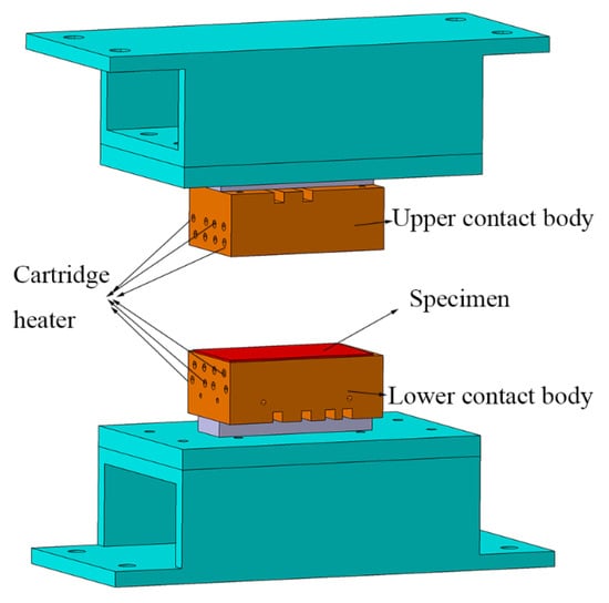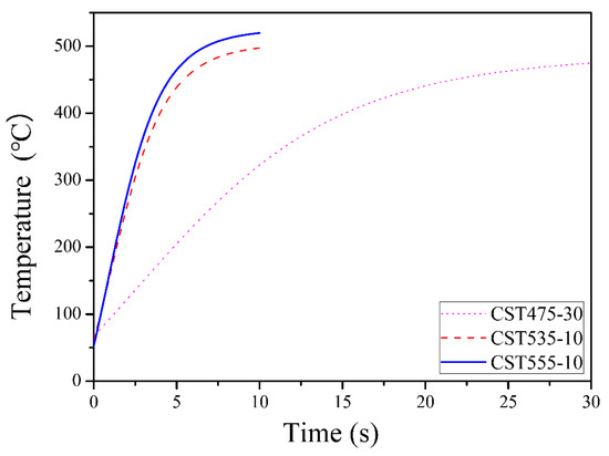 The 2 mm 7075-T6 Al alloy was used and its chemical composition is shown in Table 1. The experimental device is shown in Figure 1. It mainly consists of the upper contact body, lower contact body, and cartridge heaters. The specimens were put between two heated contact bodies to be heated with different holding time (including heating time). For the detailed contact solution device and methods refer to references [7,8]. Three solution temperatures were used to study the effect of solution temperature on the microstructures and the mechanical properties. The experimental parameters are shown in Table 2. Three specimens were repeated for each condition. After being quenched, artificial aging (AA) treatment of solution specimens was conducted at 120 °C for 24 h. Figure 2 displays the heating rates with different solution temperatures. When the contact bodies temperature is 475 °C, the heating rate of the specimen is 15.8 °C/s and the temperature of the specimen can reach 470 °C with 30 s holding time. With the contact bodies temperature increasing to 535 °C, the heating rate rises to 50 °C/s and the temperature of the specimen can reach 500 °C within 10 s. When the contact bodies temperature is increased to 555 °C, the heating rate of the specimen changes little, and the temperature of the specimen reaches 515 °C after holding for 10 s.