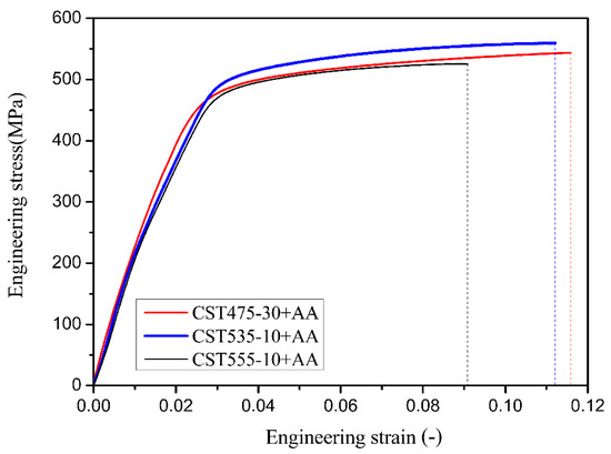 The engineering stress vs. strain curves for the specimens after ageing treatment are shown in Figure 3. The yield strength, tensile strength and elongation of the specimens are presented in Table 3. Compared with the CST475-30 + AA specimen, the strength of the CST535-10 + AA specimen increases slightly and the tensile strength reaches 545 MPa. This may be due to the fact that the high solution temperature in CST can accelerate the dissolution of the second phases. However, the strength of the CST555-10 + AA specimen decrease dramatically, which may be the result of the second phases coarsening. The decrease of elongation may be caused by the over-burning of grain boundaries due to temperature being too high.