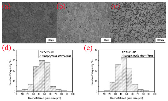 Figure 4 displays the optical microstructures of the quenched specimens with different solution temperatures. The CST475-30 and CST535-10 specimens exhibit even grains distribution, as shown in Figure 4a,b. Grain size was measured using Image J software and the results are shown in Figure 4d,e. The average grain sizes of the CST475-30 and CST535-10 specimens are 45 ± 5.4 μm and 41 ± 7.3 μm, respectively. There is little difference in grain size between them. The grain boundaries of the CST555-10 specimen show obvious coarsening (refer to Figure 4c) because of the local over-burning, which is the main reason for the decrease in the mechanical properties. Therefore, the solid temperature of 555 °C has a significant negative impact on the mechanical properties.