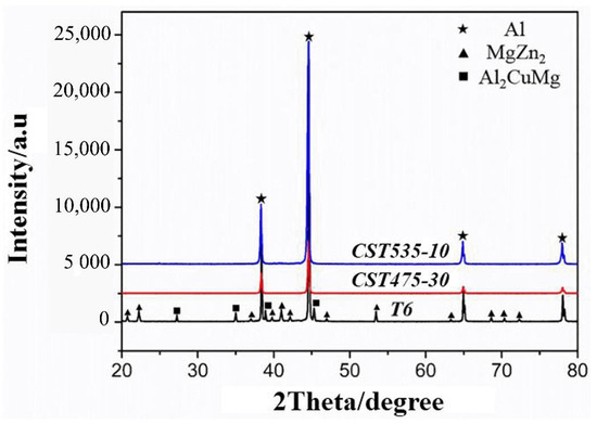 Figure 5 shows the X-ray diffraction (XRD) results of the CST475-30 and CST535-10 specimens. The second phases of Al–Zn–Mg–Cu alloys are mainly composed of the low-melting MgZn2 phase, the high-melting Al2CuMg phase, and the insoluble phases such as Mg2Si and Al7Cu2Fe [18,19]. After solution treatment, the phase peaks of MgZn2 and Al2CuMg basically disappear, which indicates that most of MgZn2 and Al2CuMg phases dissolve. Using the calculation, the lattice parameters a of the two specimens are 4.0627 nm and 4.0638 nm, respectively. It can be inferred that the lattice distortion of CST535-10 specimen is larger because of more second-phase dissolution. The second phase solubility is inversely proportional to the conductivity [20]. The conductivities of the quenched CST475-30 and CST535-10 specimens are 18.2 MS/m and 17.8 MS/m, respectively. It can also demonstrate that the lattice distortion of the CST535-10 specimen is larger, which is in agreement with the results of the lattice parameters calculation.