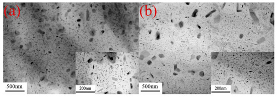 Figure 6 displays the TEM microstructures of the specimens after ageing treatment. Compared with the CST475-30 + AA specimen, the number densities of the precipitates of the CST535-10 + AA specimen were obviously increased. The reason is that the ultra-high solid solution temperature could eliminate the segregation of solute elements in the alloy, which was beneficial to the nucleation and precipitation of the second phases. In addition, the solution temperature increase would obtain the higher supersaturated vacancy concentration after quenching and promote the dispersed precipitation and uniform distribution of the second phases. Therefore, the precipitation strengthening effect of the CST535-10 + AA specimen was better. For Al–Zn–Mg–Cu alloys, Orowan strengthening is the main strengthening mechanism, and the strengthening effect mainly depends on the size and quantity of the second phase particles, as shown in Equation (2):