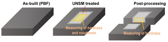 In most studies on UNSM treatment for additively manufactured materials, the rough surfaces were removed first through post-AM machining, and then surface treatment was applied. On the contrary, in this study, UNSM was applied to the deposited surface without post-processing as a surface treatment to improve the poor surface quality and mechanical performance of products created by PBF. In this study, the process conditions of UNSM for a PBF-deposited surface were varied to analyze their effects on surface roughness and hardness. The response surface methodology (RSM) and Box–Behnken design (BBD) were applied to derive process conditions that can most significantly improve surface roughness and hardness. In addition, regression analysis-based mathematical models for predicting the roughness and hardness after UNSM treatment are presented and compared with a specimen whose surface was processed through machining.