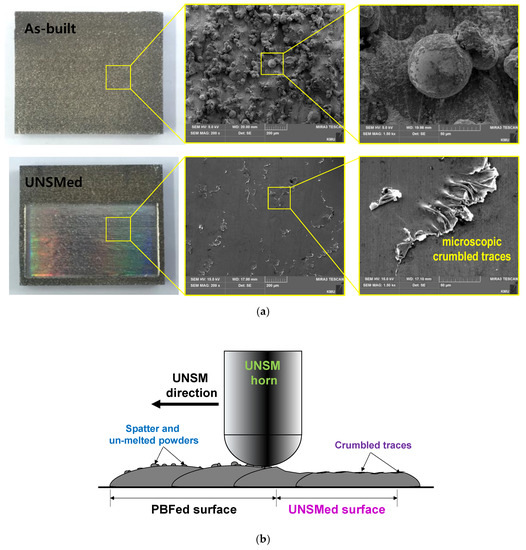 Meanwhile, unlike the as-built specimen with dark color, a glossy surface can be observed in the UNSM-treated area. In particular, the surface of the UNSMed sample shows that the irregular surface of the as-built specimen due to the spatters and un-melted powder was clearly improved by UNSM treatment. Figure 4b shows that the as-built surface became smooth as the spatters and un-melted powder on it were compressed by the impact of the ball tip. The crumbed traces left during the process of compressing the spatters and un-melted powder can be observed from the surface of the UNSMed sample. Such microscopic crumbled traces are expected to affect the surface roughness.