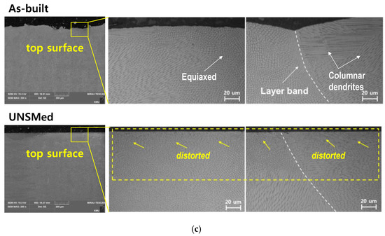 Figure 4c shows a cross-sectional image of the microstructure in the near-surface layer. In the as-build specimen, an equiaxed structure can be observed at the center of the deposited track, with columnar dendrite structures mainly formed on the outer sides (around the layer bands) of the deposited beads. Examination of the locations and orientations of the columnar dendrites reveals differing solidification rates between the center and outer sides of the beads. In addition, the equiaxed structures at the center of the deposited beads are finer than the outer columnar dendrites. The columnar dendrites grow from the outer edge toward the center, which also attests to differing cooling rates between the center and outer sides. Meanwhile, in the UNSMed sample, severe plastic deformation can be observed to occur in the UNSM direction. The high-magnified images show that the microstructures of the UNSM-treated surface are distorted up to a certain depth.