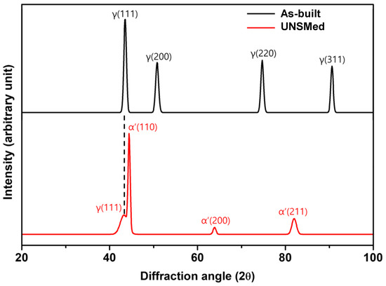 Figure 5 shows X-ray diffractograms of the microstructures and microstructural phases formed on the surfaces of the as-built and UNSMed specimen. Hence, it was confirmed that the phase mainly constituting as-built is austenite (γ). In addition, several peaks were observed. After UNSM treatment, the austenite phase decreased notably. This phenomenon occurred because severe plastic deformation was induced on the austenite by the UNSM; consequently, the austenite was transformed into martensite. Umemoto [34] reported on a mechanism for martensitic transformation as one cause of the increased fineness of a metal surface structure following severe plastic deformation. Furthermore, the martensitic transformation phenomenon of surface structures occurring in metals and alloys such as pure iron (Tao et al. [35]), AISI 304 (Zhang et al. [36]), and AISI 316 L (Roland et al. [37]) have been discussed.