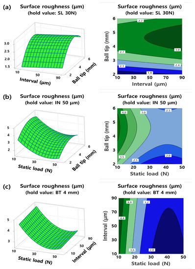 RSM results for roughness between (a) inter-pass interval and ball tip diameter, (b) load and ball tip diameter, and (c) load and inter-pass interval.