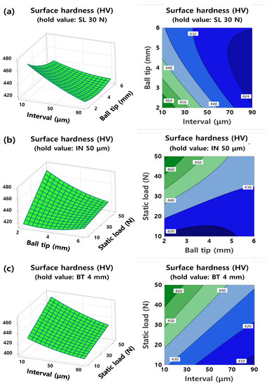 Figure 8 shows the surface plot and contour plot for the regression model of the surface hardness response value represented by Equation (2). Figure 8a shows the response surface of hardness according to the ball tip diameter and inter-pass interval. The load was fixed at 30 N, which is the mid-level. The hardness varied significantly depending on the inter-pass interval and ball tip diameter. This agrees with the ANOVA results in Table 6. The hardness increased as the inter-pass interval and ball tip diameter decreased. The response surface of hardness according to the load and ball tip diameter (Figure 8b) also shows that the hardness significantly varied depending on these two parameters. The hardness increased as the ball tip diameter decreased and increased as the load increased. The hardness significantly varied as the strain energy density E increased because the amount of strain energy transmitted to the surface increased; thus, the microstructures were refined more easily, as shown in Equation (2). Figure 8c shows the response surface of hardness according to the inter-pass interval and load. This response surface is similar to that shown in Figure 8a. The hardness varied significantly depending on the inter-pass interval and load. The hardness increased as the inter-pass interval decreased and load increased. Because the transmitted energy density can be maximized at high loads and low inter-pass intervals, the hardness was significantly increased by grain refinement, strain hardening, and an increase in compressive residual stress due to the energy increase. Finally, the following optimal values for the three conditions to obtain the maximum surface hardness could be derived through RSM: ball tip diameter of 2.38 mm, inter-pass interval of 10 μm, and load of 50 N. The obtainable surface hardness under these conditions is expected to be 504 Hv, which is significantly improved compared to the hardness of the PBFed specimen before UNSM treatment (250 Hv).