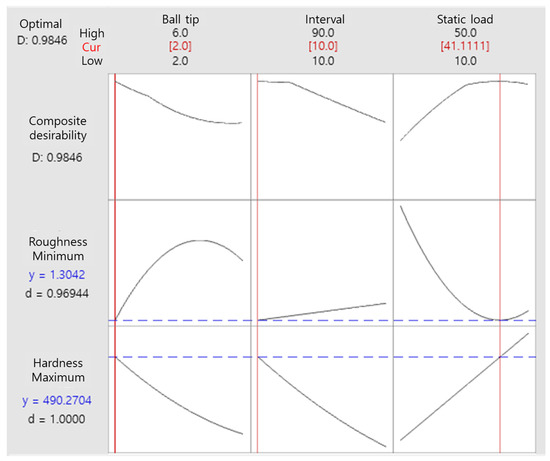 Figure 9 shows the results of the response optimization for surface roughness and hardness. A load of 41.11 N, interval of 10 μm, and ball tip diameter of 2.38 mm were derived as the conditions that improve surface roughness and hardness most significantly. Under these optimal conditions, the hardness was predicted to be 490 Hv (desirability for SH = 100%), and the roughness was predicted to be 1.30 μm (desirability for Ra = 96.94%). The composite desirability for these is 98.46%, which is close to the maximum. According to previous single-objective optimization results, the optimal conditions for roughness were a ball tip diameter of 2.38 mm, interval of 10 μm, and load of 41 N, and the expected surface roughness under these conditions was 1.30 μm. For hardness, the derived optimal conditions were a ball tip diameter of 2.38 mm, interval of 10 μm, and load of 50 N, and the expected hardness under these conditions was 504 Hv. In the results for both single-objective optimization and multi-objective optimization, the same conditions were derived for the ball tip diameter and interval. However, for the optimal load condition, 50 N was derived in the single-objective optimization for hardness, while 41.11 N was derived in the multi-objective optimization for surface roughness improvement. This demonstrates the ability of multi-objective optimization to improve surface roughness and hardness simultaneously. Nevertheless, a high hardness of 490 Hv could be obtained as the final expected hardness. Consequently, the optimal conditions by multi-objective optimization were favored. However, considering the minimum units of the parameters that could be set in the experiment, a load of 40 N, interval of 10 μm, and ball tip diameter of 2.38 mm were selected as the final optimal conditions.