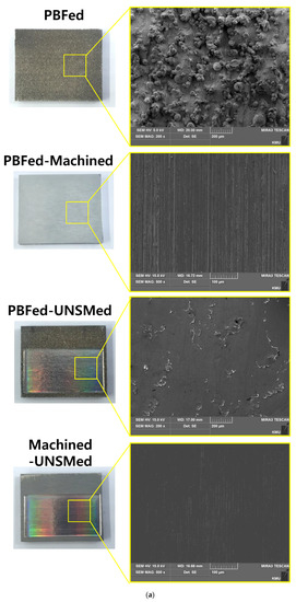 The above results show that machining is more effective than UNSM treatment for improving the surface roughness after PBF. However, considering the increase in hardness due to UNSM treatment, UNSM treatment can also be used as a post-process for PBFed materials. Of course, UNSM treatment after machining PBFed materials can be proposed as the most effective post-process. However, this causes an increase in production cost due to an additional process. Therefore, it is necessary to select a suitable surface post-processing method considering the surface roughness and mechanical property improvement of the material being manufactured by PBF.
