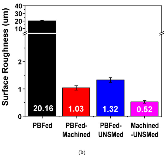 However, compared to the specimen treated with UNSM after machining (machined-UNSMed sample), the surface roughness was 49.42% higher and hardness was 3.43% lower. In particular, the improvement in roughness of the PBFed-UNSMed sample was insufficient compared to the machined-UNSMed sample. Therefore, the surface modified through UNSM after deposition cannot be applied to precision machine components that require superior surface roughness. In other words, machining after AM by PBF can be more effective than UNSM treatment in improving surface roughness. However, considering the increase in hardness due to UNSM treatment, UNSM treatment can also be used as post-processing for PBFed materials. The application of both machining and UNSM can be used as a post-processing method for maximizing the improvement in surface roughness and hardness. However, this may cause an increase in production cost due to the additional post-processing. Therefore, it is necessary to select a suitable post-processing method considering the changes in surface roughness and mechanical properties due to UNSM treatment, as confirmed by the above comparative experiment results. In future work, a methodology for UNSM treatment that can further improve the surface roughness of deposited material without machining should be investigated.