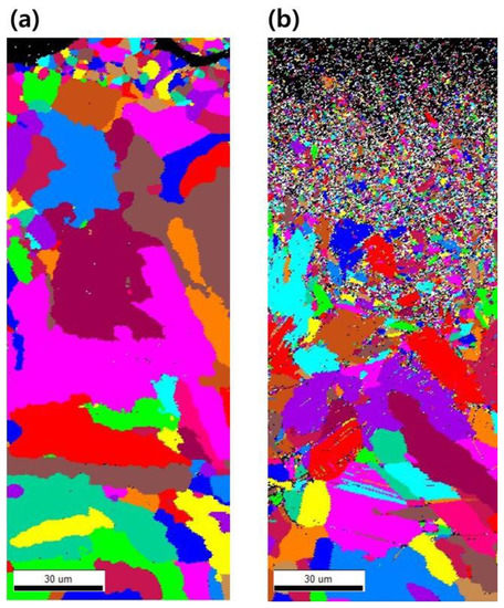 EBSD results of microstructure near UNSM treated surface: (a) before and (b) after treatment.