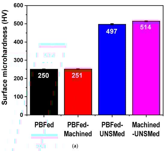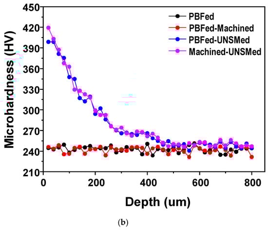 Figure 12a shows the change in surface hardness after UNSM treatment. As is already known, machining does not affect the surface hardness. Therefore, the hardness of the PBFed sample did not change after machining. However, it must be noted that the hardness was significantly increased after UNSM treatment (PBFed-UNSMed and machined-UNSMed samples) regardless of machining. Compared to the PBFed sample, the PBFed-UNSMed and machined-UNSMed sample exhibited 98.44% and 105.25% higher hardness, respectively. The surface hardness of the machined-UNSM was approximately 3.43% higher than that of PBFed-UNSM. This appears to be because spatters and un-melted powder were present on the surface of the PBFed sample without machining, and some of the energy transmitted by the impact of the ball tip contributed to the compression of the spatters and un-melted powders. For the machined-UNSMed sample, it is estimated that all of the energy transmitted by the impact of the ball tip was used for microstructure refinement and modification because spatters and un-melted powder were removed by machining.
