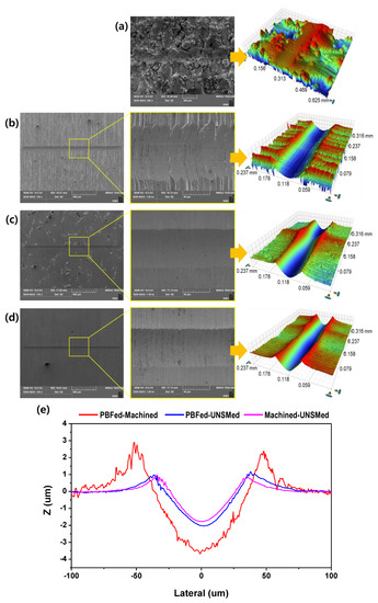 SEM images and 2D/3D groove shapes after scratch test: (a) as-built (PBF), (b) PBFed-machined, (c) PBFed-UNSMed, (d) machined-UNSMed, and (e) 2D profiles of the scratched grooves.