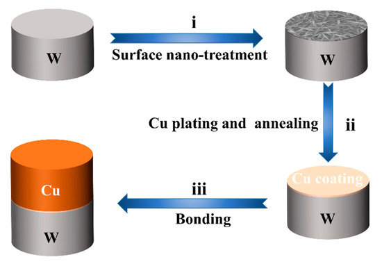 - Cu plating on the surface of nano-treated W, followed by annealing at 980 °C for 3 h to realize Cu penetrating;