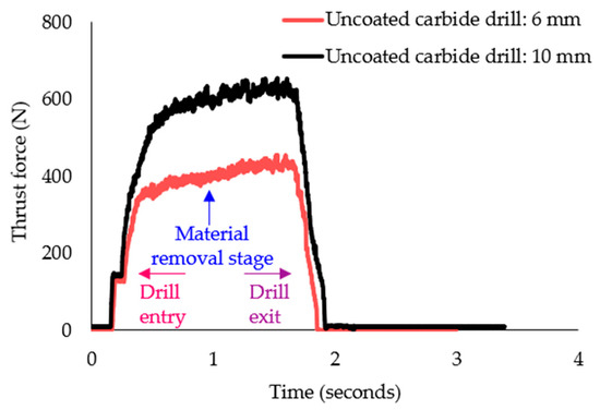 Figure 1 shows the thrust force (Fz) generated signals of 6 mm and 10 mm drills for one of the drilled holes. The first region of the force signals shows the drill engagement where the tool penetrated the workpiece and Fz began processing. With the drill bit’s advancement, the Fz gradually increased then reached a steady state while the drill was in full contact with the workpiece. The Fz declined rapidly when approaching the bottom side of the workpiece and then reached zero when the drill bit completely exited the workpiece, indicating the end of the drilling process [29].