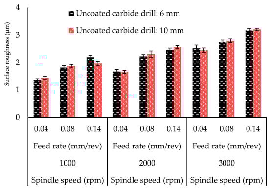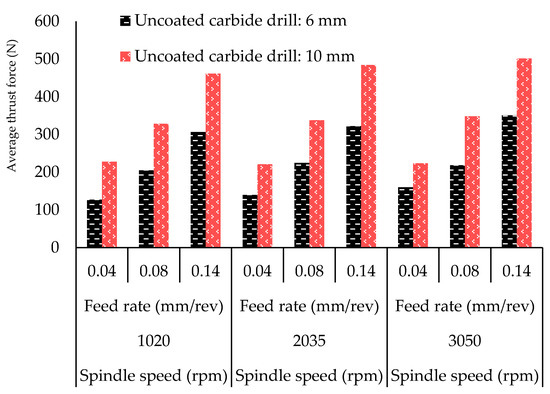 The average Fz measured during the dry drilling process using 6 mm and 10 mm drill size at different n and f selected in this study is given in Figure 2. The results showed that the 10 mm drills generated a higher Fz compared to that from the 6 mm drills due to the larger contact area between the drill and the workpiece. Figure 2 also illustrates that Fz increased as n and f increased; however, the ANOVA analysis in Table 3 indicated that f had the highest percentage contribution at 67.33%, followed by the drill diameter with a contribution of 29.53%, while the influence of n was insignificant (0.81%). The increase in Fz due to the increase in f might be associated with the increase in uncut chip thickness [30,31,32]. A confidence interval of 95% was used in the ANOVA; therefore, the influence of each process parameter on the responses was considered insignificant if their p-values were estimated at more than 0.05.