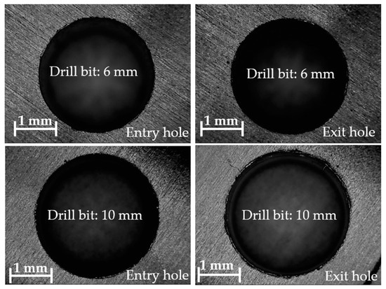Figure 5 shows the borehole for 6 and 10 mm holes drilled using the same cutting parameters. The SEM graphs reveal that the hole edge quality at the entrance was better than at the exit, regardless of the drill size. Moreover, it was also found that the hole edge quality at the entrance was better in holes drilled using 6 mm drills than those drilled using the 10 mm drills. This was also observed in the remaining drilled holes using different cutting parameters. The larger contact area between the cutting tool and workpiece at the start of the drilling process means that larger thrust force is required before the cutting tool is in full contact with the workpiece, leading to increased deformations and damage to the hole entry.