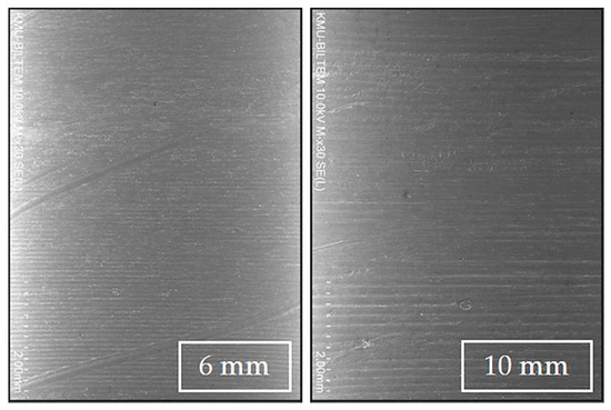Similarly, the hole edge quality at the exit was better in holes drilled using 10 mm drills, as can be seen from Figure 5. It is speculated that the larger cross-sectional area of the 10 mm drills provided more stability and rigidity while drilling throughout the hole, which gave better cutting quality while the tool was exiting the workpiece. This claim can be supported by the fact that the surface deformations and damage observed on the boreholes drilled using 6 mm drills were somewhat more visible than those drilled using the 10 mm drills. Another observation supporting this claim is that aggressive helical feed marks were found on the inner surfaces of some of the holes drilled using the 6 mm drills, as shown in Figure 6. This would imply that the chip collision with the inner walls of the holes was more aggressive when using the 6 mm drills, which could be, as stated earlier, due to less drill stability.