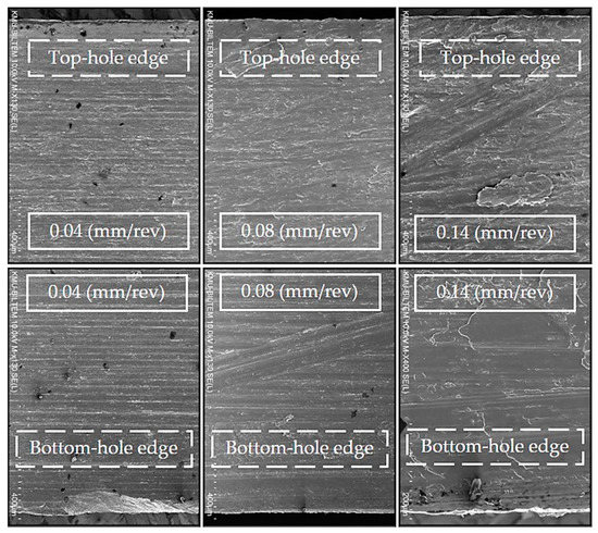 Figure 7 shows the surface condition of holes drilled using 6 mm drills at different feed rates. It was observed that increasing f tended to reduce the hole surface quality. This is mainly attributed to the increased chip thickness with the increase in f. For example, when drilling at an f of 0.14 mm/rev, there are more clear signs of smearing and plastic flow due to severe plastic deformation on the upper and lower sides of the hole as well as throughout its thickness. This was also observed in holes drilled using the 10 mm drills and therefore is purely related to the increase in f.