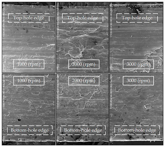 Figure 8 shows the borehole condition for holes drilled using 10 mm drills at a different n and a constant f of 0.14 mm/rev. The results show that the edge quality at the hole entry seems to worsen with the increase in n, while the hole edge quality at the exit seemed to be unaffected. The results also showed that increasing n beyond 2000 rpm increased the severity of deformations due to plastic flow around the hole surface. This could be attributed to the increase in the cutting temperatures and ductility with the increase in n, which softens the material and induces more thermal stresses. It is also well known that the AA2024-T3 alloy possesses a relatively high percentage of elongation, which can affect the burr formation at the hole entry and exit sides [29]. For clarification, Figure 9 reveals the defects in the hole walls of AA2024-T3 from 6 mm and 10 mm drill bits.