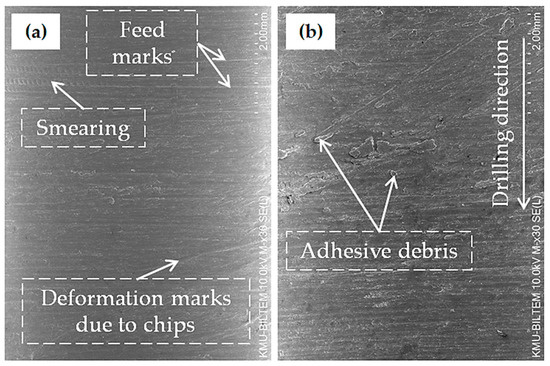 Hole surface damage analysis of AA2024-T3: (a) 6 mm drill bit and (b) 10 mm drill bit.