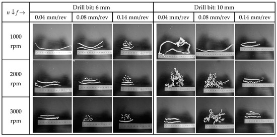 Chip formation and its breaking mechanism signify the smooth drilling process [36]. Accordingly, the long and continuous chips can easily become tangled around the drill bit flutes and require manual removal, affecting the production [37]. Furthermore, the undesirable chips increase the formation of built-up edge (BUE), which in return would reduce the quality of holes [38]. Commonly, the reason behind the formation of BUE is the higher value of the coefficient of friction at the tool–chip interface [39]. Figure 10 shows the chips produced during dry drilling of AA2024-T3 using 6 and 10 mm uncoated carbide drills. The chip analysis showed that 10 mm uncoated carbide drill bits had thickened chips compared to the drill size of 6 mm because of the large cross-sectional area covered by its larger size [40]. Figure 10 also shows that, with the increase in both n and f, the length of the chip became shorter, while the thickness of the chip increased with the increase in f and decreased with the increase in n, irrespective of the drill size.
