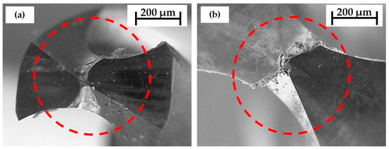 In the machining process, chips can adhere to the cutting tool to form BUE, resulting in deterioration of the cutting tool [41]. Additionally, according to Rodríguez et al. [24], during dry drilling operations there are chances of both high friction phenomena and chemical diffusion, which cause adhesion, burn marks, and flank wear. Therefore, the higher formation of BUE in drilling affects the hole quality. Depending upon the materials of the cutting tools and different geometries, BUE formation varies under the same cutting conditions. Figure 11 shows the condition of 6 mm and 10 mm drill bits during the drilling process of AA2024-T3, which indicated a BUE on both the tools. The microscopic inspection showed a higher BUE on the 10 mm drill bit compared to the drill size of 6 mm. The greater BUE on the 10 mm drill bit was due to larger chip formation, increased cutting forces, and the contact area between the cutting tool and the workpiece material. In contrast, small drill size led to easy chip evacuation and chip breakage due to the smaller chips.
