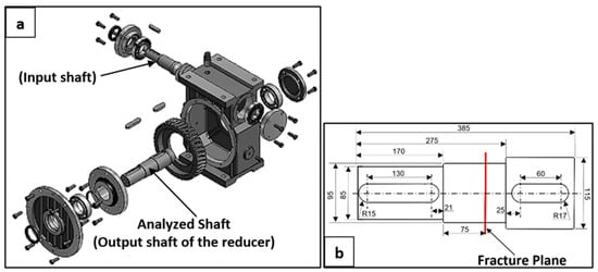 (a) Reduction box system, indicating the analyzed shaft; (b) dimensions in millimeters of the fractured output shaft and location of the fracture plane.