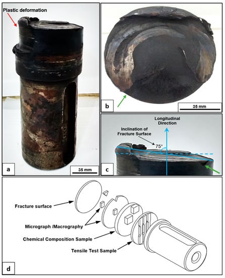 Fractured reducer shaft: (a) Side view showing the plastic deformation (red arrow) of the material under the fracture surface, (b) top view (fracture surface before cleaning), (c) fracture surface slope, (d) samples for the characterization and analysis withdrawn from the shaft. Green arrows indicate crack nucleation area.