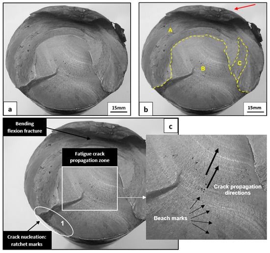 An important fractographic characteristic was that the main fatigue crack grew from the surface of the shaft (Figure 4c, see white ellipse), following a slightly helical path towards the center. In general, this propagation morphology is associated with flexion/torsion loads on rotating shafts [,,]. Regarding the beach marks, they showed a very pronounced texture, with a very clear interspacing between the marks. This texture aspect is associated with the low cycle fatigue (LCF) mechanism []. In LCF, crack propagation occurs under stresses above the flow limit of the material, promoting failure during a reduced number of cycles [,]. In addition, it should be noted that in the case of rotary shafts, such as the one in the present study, each point on its surface is subjected to a tensile stress and, subsequently, a compressive stress, for each revolution carried out []. This type of alternate loading explains the nucleation of the crack at the shaft surface and its propagation towards the center [,].