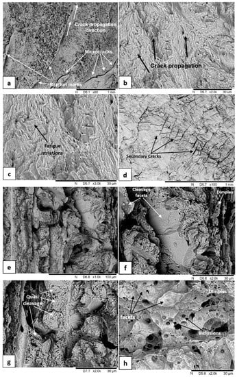 Fracture micromechanism: (a) Ratchet and microcracks brands; (b) fatigue propagation and striations; (c) detail of (b); (d) secondary crack found in zone C; (e) region of quasi-cleavage fracture containing traces of a fragile fracture by cleavage and dimples; (f–h) are details of (e).