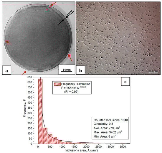 Thus, using the mean and maximum area values of the analyzed inclusions (Figure 6c), the mean and maximum inclusion size was 19 and 66 µm. From observing Figure 6c, it is evident that the vast majority of inclusions had an area smaller than 500 µm2 (size of 25 µm). Therefore, the critical parameter of inclusion size was verified [], related to the threshold value for the propagation of fatigue cracks. This critical value was around 50 to 100 µm []. However, when the inclusions were just below the surface, inclusions smaller than a 45 µm fracture were responsible for fatigue [].