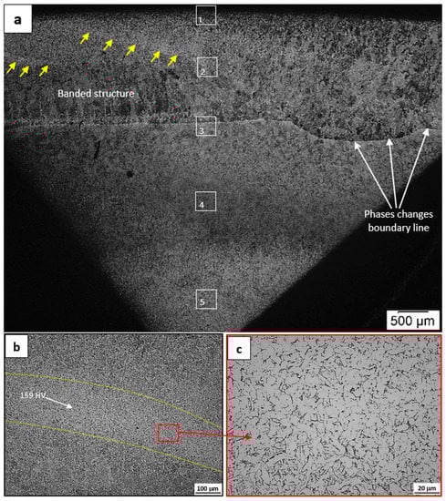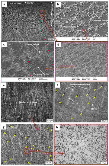 Region 2 shows a pattern of banded structure that extends up to the phase boundary line (Figure 7). Figure 8e presents a quasi-polygonal ferrite matrix [] in a dark color, and the white Widmanstätten ferrite in white, arranged in bands (Figure 8f,g). The matrix of quasi polygonal ferrite has grains with a non-uniform distribution and irregular shapes (Figure 8h). The matrix presented a microhardness of 216 ± 14 HV, and the Widmanstätten ferrite, a microhardness of 165 ± 9 HV. Additionally, in a banded structure zone, some tracks of polygonal ferrite were nucleated with a small amount of pearlite within the limits of the ferrite grains and the microstructure is detailed in Figure 7b,c. The microstructure also exhibited a low microhardness, with a value of 159 ± 11 HV.