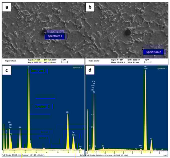 It is important to mention the existence of the high amount of inclusions distributed in the matrix (indicated by the yellow arrows in Figure 8f,g). The chemical composition of these inclusions was evaluated by EDS, although it is a semi-quantitative technique. Figure 9 shows the SEM image of an inclusion indicating the points of analysis and the spectrum. Large amounts of manganese (Mn), silicon (Si), sulfur (S), aluminum (Al), and oxygen (O) were detected in the inclusion, and the results are summarized in Table 4. The presence of these elements indicates that the inclusions were composed of oxides and sulfides formed by these elements. The high iron content observed in the analysis was due to the interference of the ferritic matrix during the analysis in SEM.