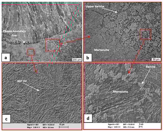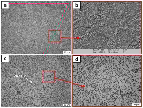 (a) Phase transition of the banded structure; (b) martensite with some colonies of upper bainite; (c) martensite microstructure; (d) detail of (b).